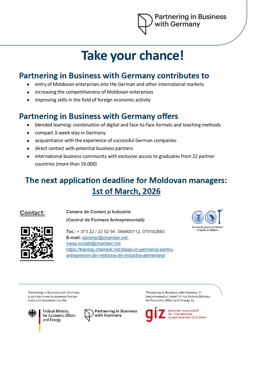 Центр делового образования при Торгово-промышленной палате РМ совместно с немецким обществом GIZ приглашает руководителей молдавских предприятий к участию в Программе повышения квалификации “Молдова-Германия”. Официальная страница программы – https://partnering-in-business.de/en/